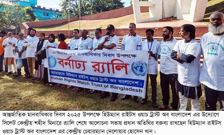 আন্তর্জাতিক মানবাধিকার দিবস ২০২৫ উপলক্ষে হিউম্যান রাইটস ওয়াচ ট্রাস্ট অব বাংলাদেশ–এর উদ্যোগে সিলেটে র্যালি ও আলোচনা সভা অনুষ্ঠিত হয়েছে। মানবাধিকার বিষয়ে জনসচেতনতা বৃদ্ধি এবং ন্যায়বিচার প্রতিষ্ঠায় নাগরিক অংশগ্রহণ নিশ্চিত করার লক্ষ্যে এ কর্মসূচি আয়োজন করা হয়।