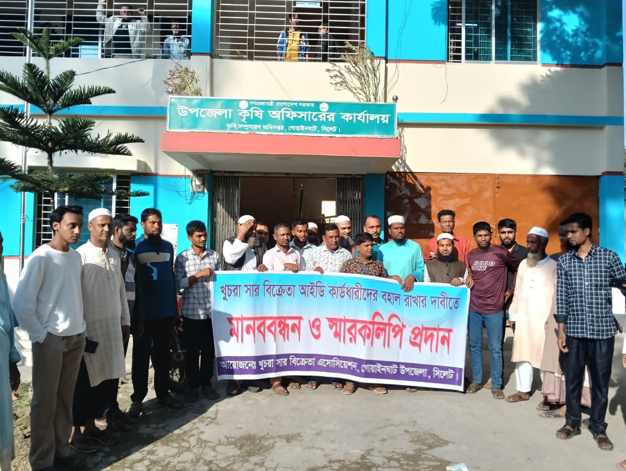গোয়াইনঘাটে খুচরা সার ডিলারদের লাইসেন্স বহাল রাখার দাবিতে মানববন্ধন অনুষ্ঠিত