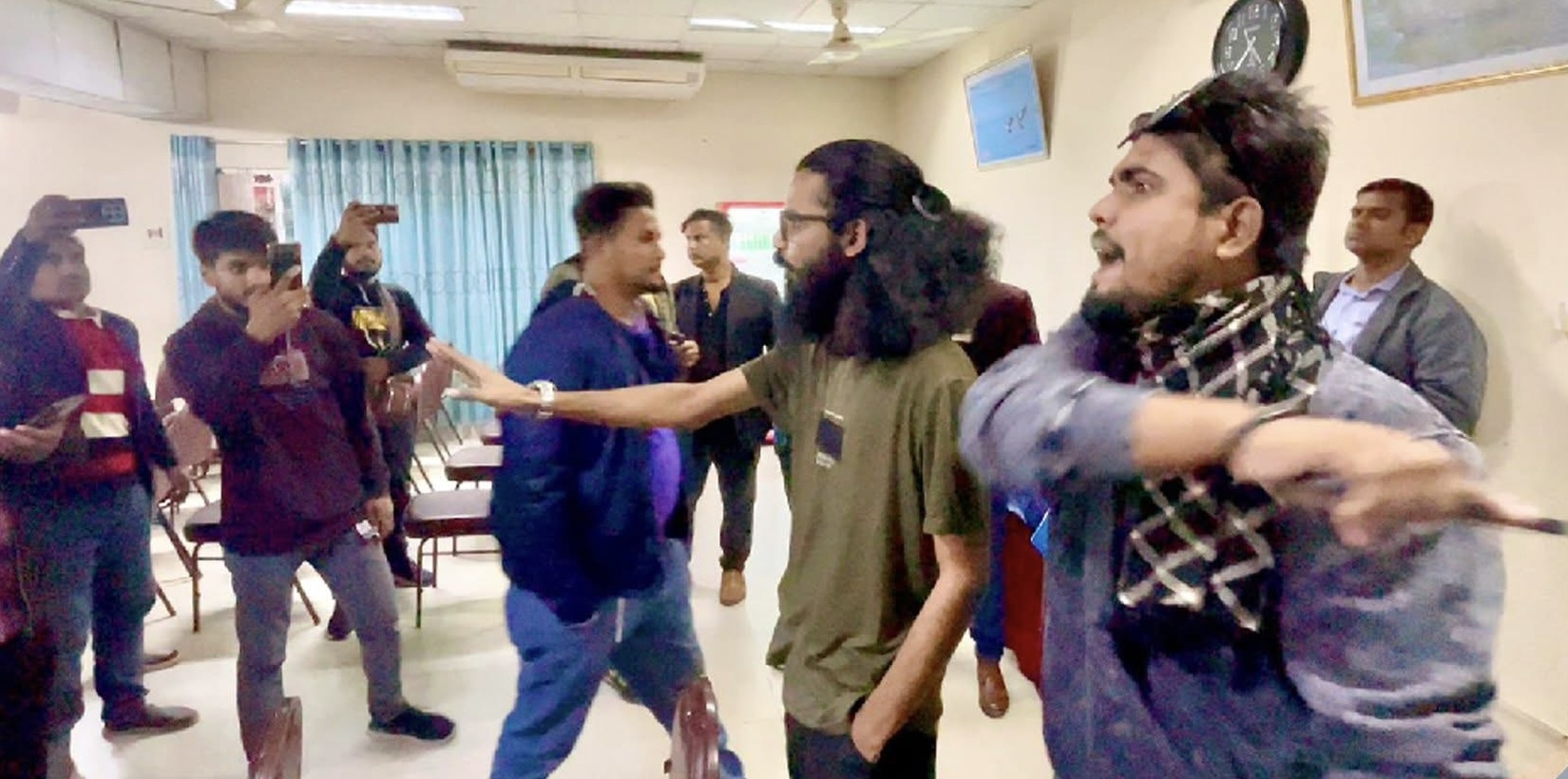 পাশ থেকে ফারাবি বলেন, ‘এত লোক সব বাইরে বসে আছে। আপনারা ফাইজলামি করছেন এখানে, নাকি?’ সাংবাদিকেরা কিছু না বললে ফারাবি আবার বলেন, ‘ভাই চিল্লাচ্ছি, কানে যাচ্ছে না কথা?’