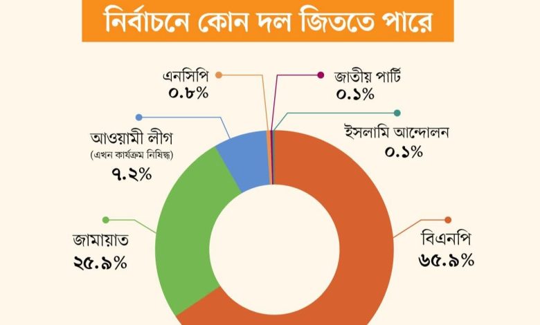 আগামী জাতীয় সংসদ নির্বাচনে সবচেয়ে বেশি আসনে বিএনপি জয়ী হবে বলে মনে করেন দেশের বেশির ভাগ মানুষ। মানুষের পছন্দের তালিকায় দ্বিতীয় দল হচ্ছে জামায়াতে ইসলামী। অন্যদিকে অর্ধেকের বেশি মানুষ মনে করেন, বিএনপি জয়ী হলে দেশের ভালো হবে। আর প্রায় এক-তৃতীয়াংশ মানুষ মনে করেন, জামায়াতে ইসলামী জিতলে দেশের ভালো হবে।