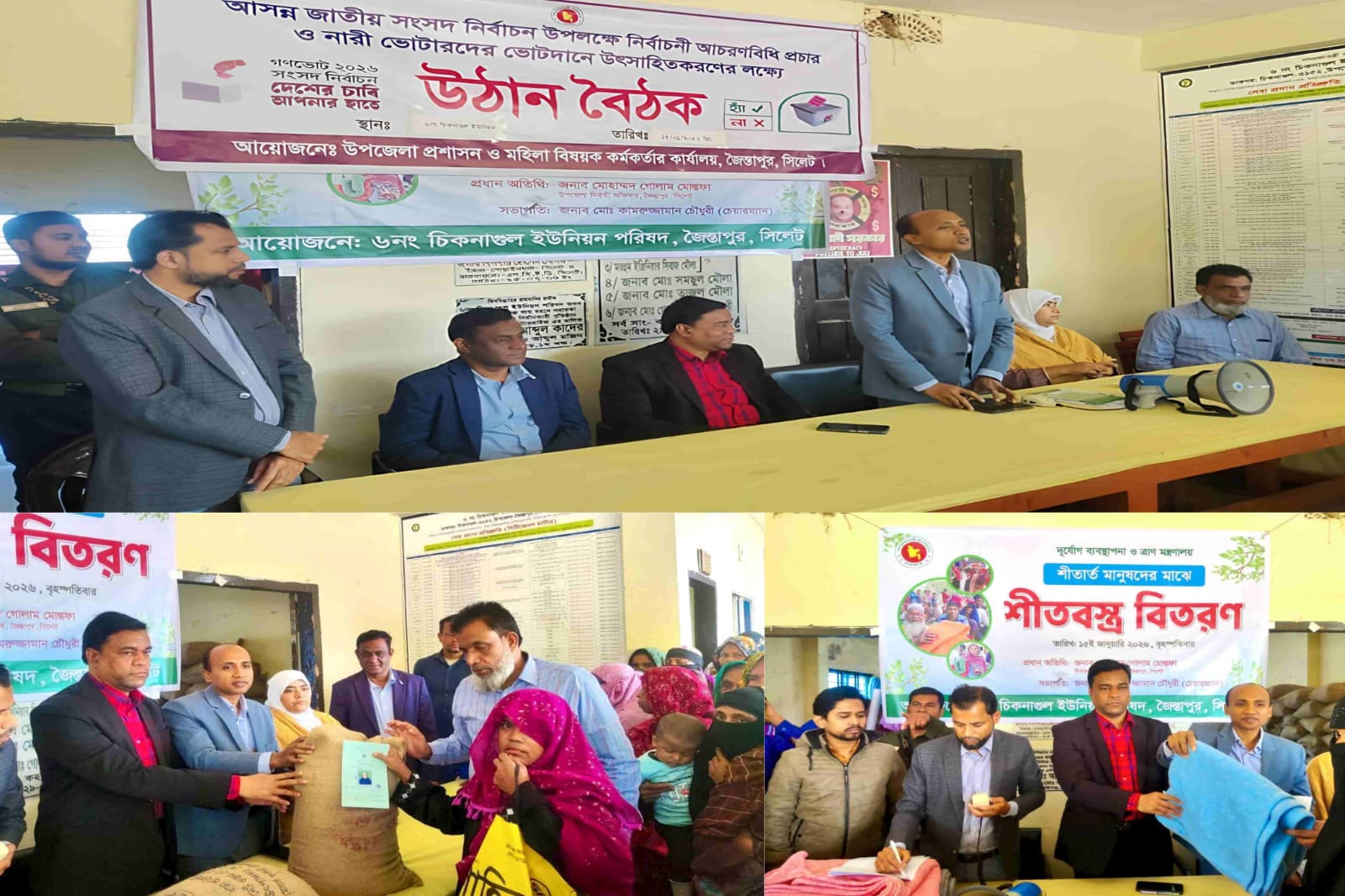 বৃহস্পতিবার (১৫ জানুয়ারি) সকাল ১১টায় চিকনাগুল ইউনিয়ন পরিষদ কার্যালয়ে জৈন্তাপুর উপজেলা প্রশাসন ও মহিলা বিষয়ক কর্মকর্তার কার্যালয়ের যৌথ আয়োজনে এ উঠান বৈঠক অনুষ্ঠিত হয়। বৈঠকের পাশাপাশি শীতার্ত মানুষের মাঝে শীতবস্ত্র এবং উপকারভোগী নারীদের মাঝে বি.ডব্লিউ.বি’র চাল বিতরণ করা হয়।