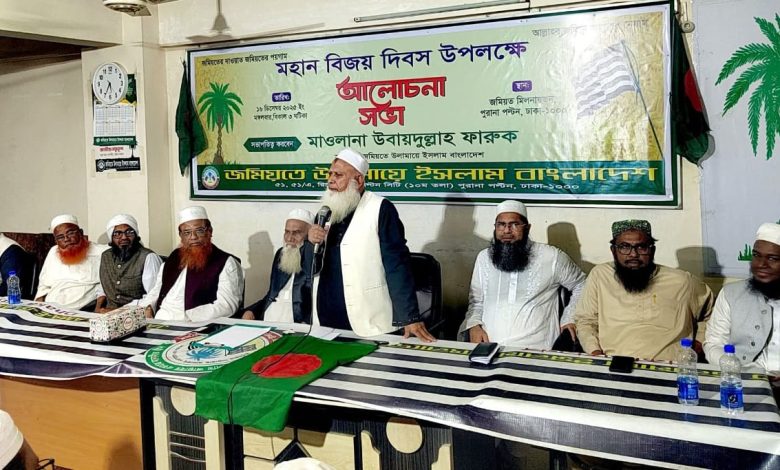 আজ মঙ্গলবার (১৬ ডিসেম্বর) বিকেলে রাজধানীর পুরানা পল্টনে জমিয়ত কার্যালয়ে মহান বিজয় দিবস উপলক্ষে আলোচনা সভায় সভাপতির বক্তব্যে জমিয়তে উলামায়ে ইসলাম বাংলাদেশের সভাপতি শাইখুল হাদিস মাওলানা উবায়দুল্লাহ ফারুক এসব কথা বলেন।