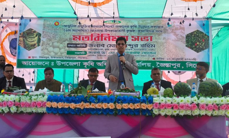 সিলেটের জৈন্তাপুর উপজেলার উমনপুর এলাকায় আধুনিক প্রযুক্তির মাধ্যমে কৃষি উন্নয়ন কার্যক্রমকে আরও কার্যকর করার লক্ষ্য নিয়ে উপকারভোগী কৃষক ও কৃষাণীদের সঙ্গে মতবিনিময় সভা অনুষ্ঠিত হয়েছে। আয়োজনে প্রকল্প বাস্তবায়নের অগ্রগতি, মাঠপর্যায়ের প্রয়োজন, প্রযুক্তি ব্যবহারের অভিজ্ঞতা এবং সেবাপ্রাপ্তির বাস্তব চিত্র নিয়ে অংশগ্রহণকারীরা মতামত দেন। শনিবার (১৭ জানুয়ারি ২০২৬) জৈন্তাপুর উপজেলার চিকনাগুল এলাকার উমনপুরে অনুষ্ঠিত এ সভায় প্রধান অতিথি হিসেবে উপস্থিত ছিলেন জনাব মোঃ আব্দুর রহিম।