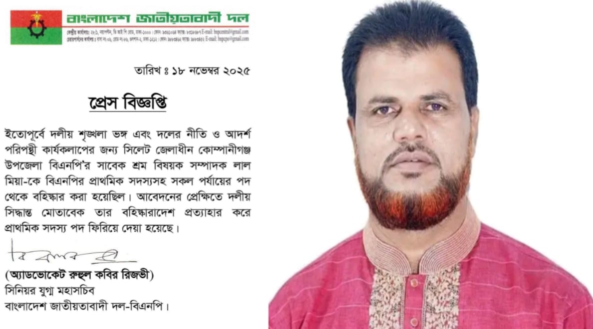 সিলেটের কোম্পানীগঞ্জ উপজেলা বিএনপির সাবেক শ্রম বিষয়ক সম্পাদক লাল মিয়াকে দল থেকে বহিষ্কারাদেশ প্রত্যাহার করেছে বাংলাদেশ জাতীয়তাবাদী দল-বিএনপি। দীর্ঘদিন ধরে বহিষ্কৃত থাকা এই নেতাকে পুনরায় প্রাথমিক সদস্যপদসহ সব পর্যায়ের দায়িত্বে ফিরিয়ে নেওয়া হয়েছে। রোজ মঙ্গলবার (১৮ নভেম্বর ২০২৫) বিএনপির কেন্দ্রীয় দপ্তর থেকে পাঠানো এক প্রেস বিজ্ঞপ্তিতে বিষয়টি নিশ্চিত করেন দলের সিনিয়র যুগ্ম মহাসচিব অ্যাডভোকেট রুহুল কবির রিজভী।বিজ্ঞপ্তিতে জানানো হয়, অতীতে দলীয় শৃঙ্খলা ভঙ্গ এবং দলের নীতি–আদর্শ পরিপন্থী কর্মকাণ্ডের অভিযোগে লাল মিয়াকে বিএনপির সব পর্যায়ের দায়িত্ব থেকে বহিষ্কার করা হয়েছিল। পরে তার আবেদনের পরিপ্রেক্ষিতে বিষয়টি পুনর্বিবেচনা করে বহিষ্কারাদেশ প্রত্যাহারের সিদ্ধান্ত নেয় দল।বিএনপি জানায়, লাল মিয়াকে পুনরায় প্রাথমিক সদস্যপদ ফিরিয়ে দেওয়া হয়েছে এবং সিদ্ধান্তটি অবিলম্বে কার্যকর হবে।কেন্দ্রীয় বিএনপি আশা প্রকাশ করেছে, ভবিষ্যতে দলীয় নীতি ও শৃঙ্খলা মেনে সংগঠনকে শক্তিশালী ও গতিশীল করতে লাল মিয়া ইতিবাচক ভূমিকা রাখবেন।