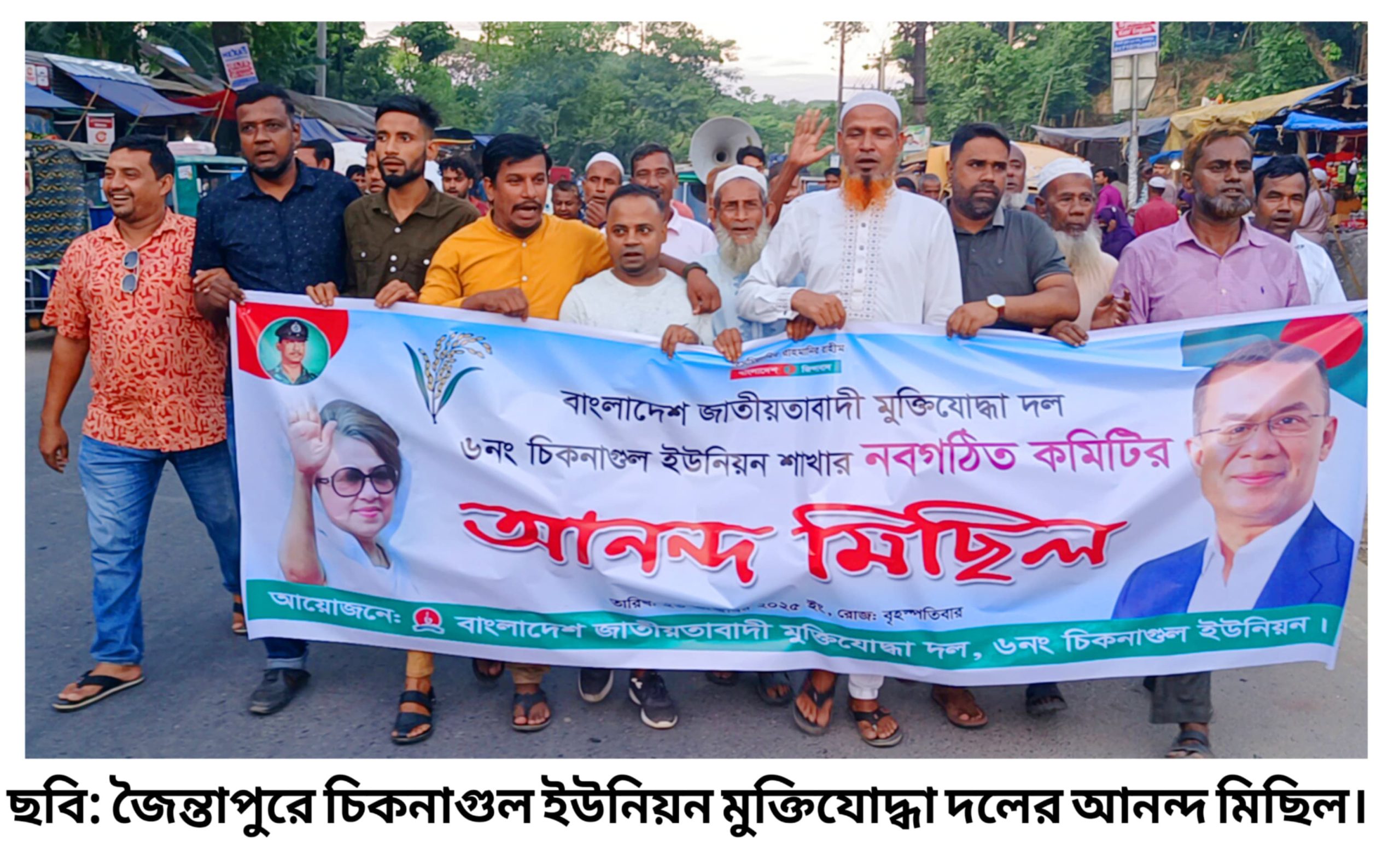 বাংলাদেশ জাতীয়তাবাদী মুক্তিযোদ্ধা দল জৈন্তাপুর উপজেলা শাখার অন্তর্ভুক্ত ৬ নম্বর চিকনাগুল ইউনিয়ন শাখার নবগঠিত কমিটির উদ্যোগে এক আনন্দ মিছিল ও পথসভা অনুষ্ঠিত হয়েছে। বৃহস্পতিবার (২৩ অক্টোবর) বিকেলে ইউনিয়নের চিকনাগুল বাজার এলাকা প্রদক্ষিণ করে মিছিলটি শেষ হয় তামাবিল মহাসড়কে, যেখানে পথসভায় নবগঠিত কমিটির নেতৃবৃন্দ ও স্থানীয় দলীয় সমর্থকেরা অংশ নেন।