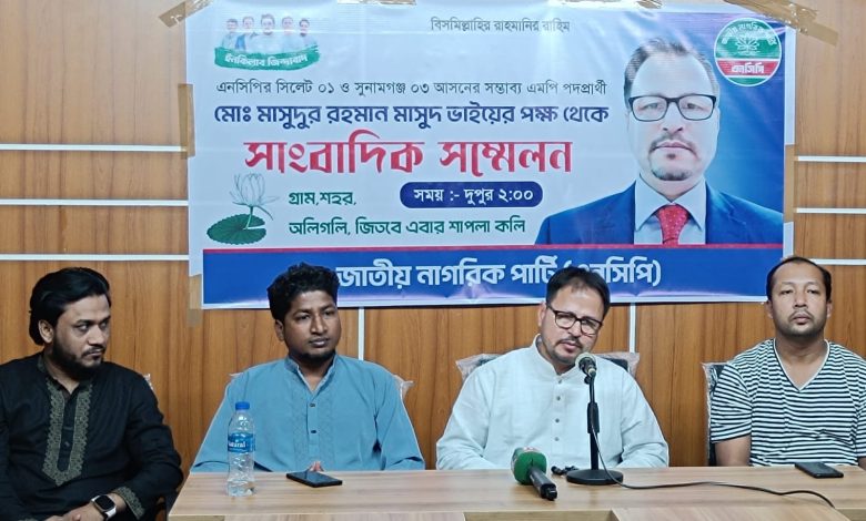 সুন্দর, সুশৃঙ্খল ও স্বনির্ভর বাংলাদেশ গড়াই আমার রাজনৈতিক অঙ্গীকার”—এই প্রতিশ্রুতি সামনে রেখে জাতীয় নাগরিক পার্টি (এনসিপি) থেকে সিলেট-১ ও সুনামগঞ্জ-৩ আসনে মনোনয়ন প্রত্যাশী মো. মাসুদুর রহমান মাসুদ সিলেটে এক সংবাদ সম্মেলনে নিজের পরিকল্পনা ও দৃষ্টিভঙ্গি তুলে ধরেছেন।