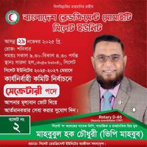 সেক্রেটারী পদপ্রার্থী মাহবুবুল হক চৌধুরী (ভিপি মাহবুব) বলেন, সিলেট ল’ কলেজের সাবেক ভিপি এবং রোটারি ডি-৬৫ ডেপুটি কোঅর্ডিনেটর (টিআরএফ) হিসেবে দেশ ও আন্তর্জাতিক পর্যায়ে সমাজ ও রাজনীতিতে সক্রিয় ভূমিকা পালনের দীর্ঘ অভিজ্ঞতা আমার রয়েছে।
